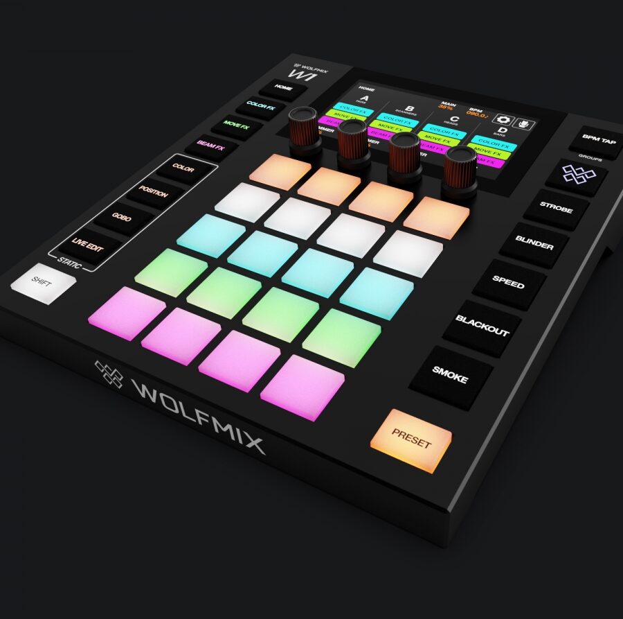 The Wolfmix W1 is a powerful DMX lighting controller designed for events, DJs, and venues that want easy control without relying on a laptop. Compact and robust, it gives you instant hands-on access to lighting effects with a clear 4.3″ touch display and 37 backlit buttons – making it simple to create dynamic shows in any hire setup.